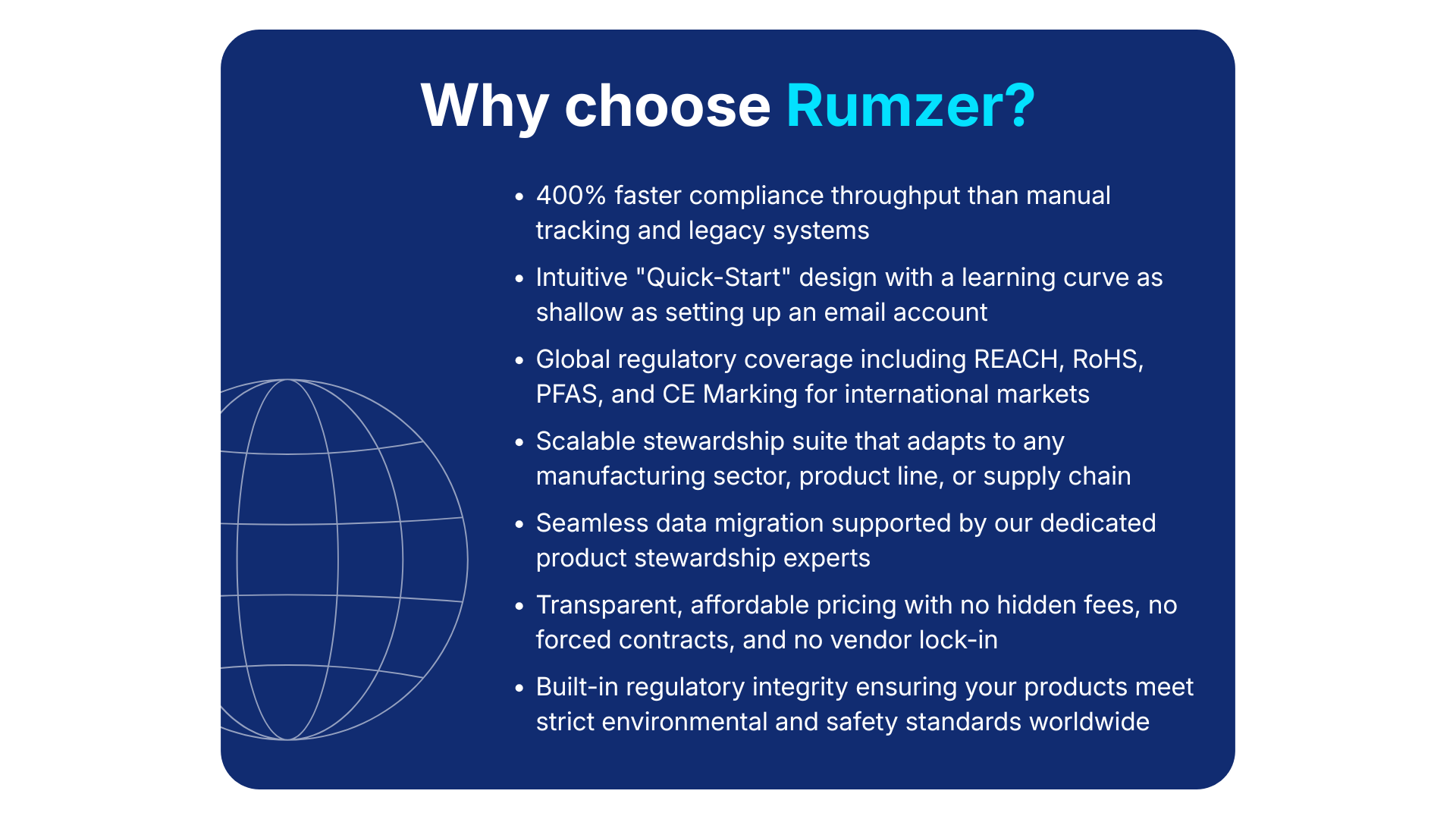 Rumzer powers faster compliance throughput, ensures global market access, and enhances overall product integrity.